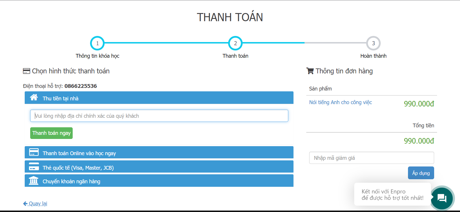- Với hình thức thanh toán chuyển khoản qua ngân hàng, nhân viên CSKH của Enpro sẽ gọi điện xác nhận và kích hoạt tài khoản cho bạn.